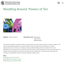 This lesson, presented by the National Nanotechnology Coordinated Infrastructure, covers the general concepts of measurement by using a pool noodle to measure objects. The activity "encourages students to consider features that are useful when developing or using a measurement tool." The lesson introduces scale by considering factors of ten which will aid in future lessons about the metric system and possibly even nanotechnology. A Teacher Preparation Guide and Student Guides for K-2 and 3-12 students are included.