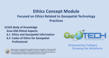 This module is provided by GeoTech Center, and discusses concepts related to ethics in geographic information systems. Module contents include a video recording, the PowerPoint presentation featured in the video, and a module overview document.