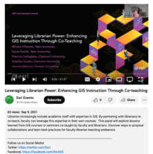 This video, from the 2021 Esri Education Summit, provides a panel about GIS library instruction and collaboration. The benefits of collaborating with librarians, the types of library GIS services, GIS librarian roles, and curriculum design are highlighted. Perspectives from educators and librarians...