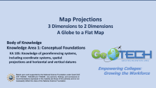 This module is provided by GeoTech Center, and introduces concepts that are related to map projections. Module contents include a video recording, a PowerPoint presentation, and a quiz that reviews the content presented in the module.