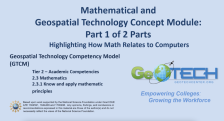 This module is provided by GeoTech Center and introduces mathematical concepts that are related to geospatial technologies. Module contents include two video recordings and a document providing an overview of the module.