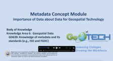This module is provided by GeoTech Center and introduces concepts related to metadata and geospatial data. Module contents include a video recording, a PowerPoint presentation, and a quiz that reviews the content presented in the module.