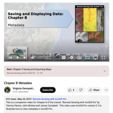 This video, provided by Virginia Geospatial Extension, is part of a series of 28 tutorial videos on remote sensing with ArcGIS Pro. This tutorial defines metadata and "illustrates various locations in ArcGIS Pro where metadata can be found." This video runs 07:56 minutes in length. The other videos...