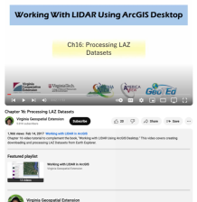 This video, provided by Virginia Geospatial Extension, is part of a series of 16 tutorial videos on using Lidar with ArcGIS Desktop. This tutorial demonstrates how to process LAZ-formatted datasets from the United States Geological Survey (USGS) using Earth Explorer. This video runs 1:53 minutes in...