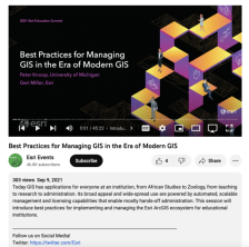 This video, from the 2021 Esri Education Summit, introduces best practices for implementing and managing the Esri ArcGIS ecosystem for educational institutions. In the video, modern GIS is defined and the importance of access is highlighted. Pillars of success in GIS are also discussed, which...