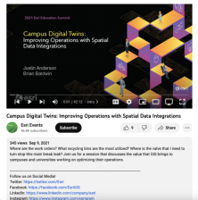 This video, from the 2021 Esri Education Summit, is a technical workshop that explores the improvement of campus operations with spatial data integrations. In the workshop, Justin Anderson and Brian Baldwin explore the problems that digital twins solve, facility information and visualization,...