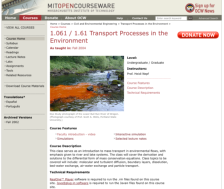 Part of MIT's innovative OpenCourseWare Project that provides materials from MIT classes to the public on the web, this site outlines a class on the physical processes by which materials, such as pollutants, are transported in the environment. The course focuses primarily on transport through water....