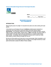 This collection from the Center for Renewable Energy Advanced Technological Education Resource Center (CREATE) is composed of teaching materials that highlight a lesson on measuring "the sun’s irradiance (radiant power received by a surface per unit of area) with an instrument used in the solar...