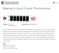 This lab, presented by the National Nanotechnology Coordinated Infrastructure, introduces students to the temperature response of liquid crystals, and how they respond in different phases of matter. In addition to liquid, solid, and gas, the fourth phase of matter includes liquid crystals which "...
