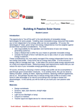 This collection from the Center for Renewable Energy Advanced Technological Education Resource Center (CREATE) is composed of teaching materials that highlight a lesson on building a passive solar home. Home energy load profile and variables that affect it are highlighted. The collection is composed...