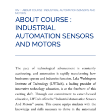 This 219-page textbook, created for the ELCT 241: Introduction to Industrial Automation course at Lake Washington Institute of Technology, covers concepts related to motors and sensors found in an industrial environment. The course familiarizes students with industrial automation through the study of motors and censors, equipping students with "the knowledge and skills necessary to thrive in the automated workplace of tomorrow." Also included are review questions for various sections. The textbook consists of the following parts: