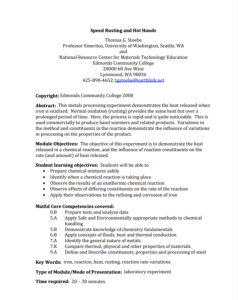 This 5-page instructor guide from Edmonds Community College outlines a laboratory experiment demonstrating the heat released when iron is oxidized. Students learn to safely prepare chemical mixtures, identify when a chemical reaction is occurring, observe the results of the chemical reaction, and apply these observations to the corrosion and rusting of iron. This activity is designed for high school and community college classrooms, and takes 20-30 minutes. The instructor guide includes the following sections: Student Learning Objectives, MatEdU Core Competencies Covered, List of Equipment and Supplies Needed, Curriculum Overview, Module Procedure, and an Evaluation Packet.