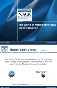 The webinar, published by the Nanotechnology Applications and Career Knowledge Support (NACK) Center at Pennsylvania State University, provides an overview of nanotechnology and an explanation of why the nano-scale is so unique. During the presentation, Dr. Stephen J. Fonash from the NACK Center outlines the many applications of nanotechnology today, including the use of nanotechnology in creating plastics and polymers, studying cancer cells, drug delivery, and creating better imaging tools for biological research.