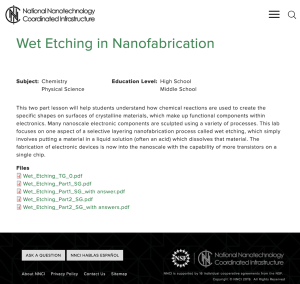 This lab, presented by the National Nanotechnology Coordinated Infrastructure, will "help students understand how chemical reactions are used to create the specific shapes on surfaces of crystalline materials, which make up functional components within electronics." The wet etching process is used to create computer chips, and through this simulated lab, students will have a chance to explore the same process using different materials. Included in this lab are: Student Worksheet #1, Student Worksheet #2, Student worksheet 1 with answers, Student worksheet 2 with answers, and a Teacher guide.