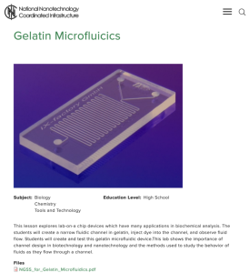 This lab, presented by the National Nanotechnology Coordinated Infrastructure, covers the concept of material properties. Students will create a microfluidic device to show "the importance of channel design in biotechnology and nanotechnology and the methods used to study the behavior of fluids as they flow through a channel." A Teacher Preparation Guide, Student Guides, PowerPoint, and Next Generation Science Standards applicable to the lesson are included.