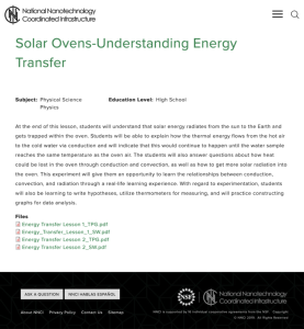 This lesson, presented by the National Nanotechnology Coordinated Infrastructure, covers the concept of solar ovens. In this lesson, students will learn how "thermal energy flows from the hot air to the cold water via conduction and will indicate that this would continue to happen until the water sample reaches the same temperature as the oven air. The students will also answer questions about how heat could be lost in the oven through conduction and convection, as well as how to get more solar radiation into the oven." Additionally, this experiment will prompt students to examine the relationships between conduction, convection, and radiation. Teacher and Student guides for parts one and two are included.