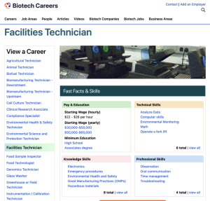 This page from Bio-Link's career website features information about the different jobs and opportunities in the facilities technician career area. This page includes a brief description of facilities technicians, who "are responsible for the operation and maintenance of biomanufacturing buildings and equipment. They monitor operations daily. They oversee systems that include heating, lighting, refrigeration, air conditioning, plumbing, water purification, air filtering, and electrical systems." Common tasks, education and training requirements, related biotechnology areas, videos from professionals, and wages are highlighted.