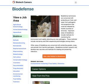This page from Bio-Link's career website features information about the different jobs and opportunities in the biodefense career area. This page includes a brief description of the biodefense field, which is "concerned with protecting air, food, and water from pathogenic microorganisms that could be released by hostile countries or terrorists." Links to related biotech career areas, articles, and videos are also included.