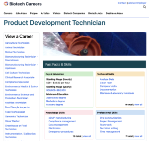 This page from Bio-Link's career website features information about the different jobs and opportunities in the product development technician career area. This page includes a brief description of product development technicians, who "assist with the creation and production of medical devices..." Common tasks, education and training requirements, related biotechnology areas, videos from professionals, and wages are highlighted.