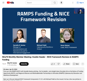 This video from the National Cybersecurity Training and Education (NCyTE) Center features two presentations that cover Regional Alliances and Multistakeholder Partnerships (RAMPS) Funding and updates to the NICE Framework. First, Danielle Santos from the National Institute of Standards and Technology (NIST) discusses the application process for obtaining funding from RAMPS, a program aimed at creating multistakeholder partnerships to develop a cybersecurity workforce that meets industry needs in a local or regional economy. Next, Karen Wetzel and Michael Prebil from NIST discuss the Workforce Framework for Cybersecurity (NICE Framework), a tool for cybersecurity workforce planning and development. Wetzel and Prebil provide an overview of the tool, its capabilities, and its value for employers, learners, and educators. Emphasized are content and format changes in the version 1.0.0 NICE update.