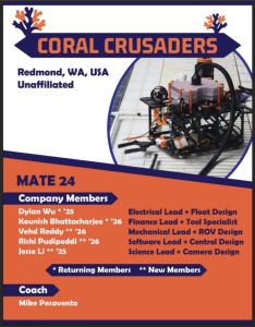 This 25-page report, from the Coral Crusaders team, describes the design and creation of subsea remotely operated vehicles (ROVs) created by the Coral Crusaders team for the Ranger class of the 2024 MATE ROV competition. MATE ROV is a global competition that challenges STEM students to build underwater ROVs to complete challenges. The competition is split into the following classes based on build complexity: Explorer, Ranger, Pioneer, and Navigator, and Scout.