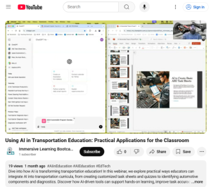 This webinar, provided by the Immersive Learning Bootcamp, demonstrates explores "practical ways educators can integrate AI into transportation curricula, from creating customized task sheets and quizzes to identifying automotive components and diagnostics." During the Webinar, Matt Boudinot from Dakota County Technical College demonstrates the use of ChatGPT for generating instructional material, such as diagnostic scenarios, rubrics, and simulating costumer interactions.