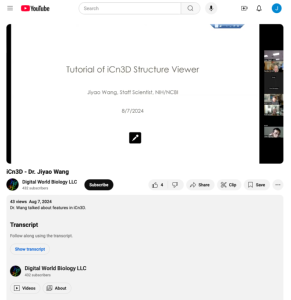 This video, published by Digital World Biology, features a tutorial of iCn3D, a web-based three-dimensional visualization and structural analysis platform for molecular structures. Throughout the tutorial, Jiyao Wang from the National Center for Biotechnology Information (NCBI) provides step-by-step instructions on performing a variety of basic and advanced functions in iCn3D, such as molecular structure alignment, analyzing mutations, and viewing electrostatic potential.