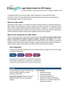 This 6-page guide, published by EvaluATE: Evaluation Resource Center for Advanced Technological Education, provides an "overview of logic model components to assist National Science Foundation Advanced Technological Education (ATE) program grant seekers and grantees in developing logic models for their initiatives." The guide introduces logic models and goes over each section and component, including core components, components related to tangible resources used and generated, and components that acknowledge contexts and systems. Also discussed are potential limitations to logic models and tips for assessing the quality of a logic model.