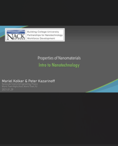 This webinar, published by the Nanotechnology Applications and Career Knowledge Support (NACK) Center at Pennsylvania State University, discusses properties of nanomaterials. During the webinar, presenters introduce nanotechnology, highlighting the effect of size and scale of on material properties. Covered are topics such as light-matter interactions at the nanoscale, force interactions at the nanoscale, quantum effects. Also discussed are various applications of nanotechnology and examples of in-class nanotechnology instruction.