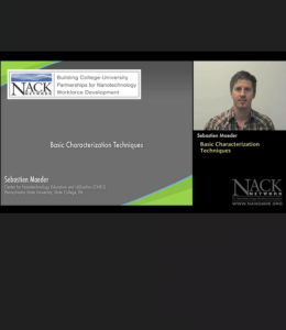 This video, published by the Nanotechnology Applications and Career Knowledge Support (NACK) Center at Pennsylvania State University, provides an overview of different basic nanomaterial characterization techniques. During the video, Sebastian Maeder from Pennsylvania State University provides an introduction to metrology and characterization followed by discussion of the following characterization tools: optical microscopes, profilometry, ellipsometry, reflective spectroscopy, and contact angle measurements