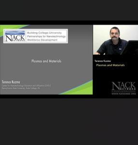 This video, published by the Nanotechnology Applications and Career Knowledge Support (NACK) Center at Pennsylvania State University, is part one of a two-part lecture on plasma and nanotechnology materials. In this part of the lecture, Terence Kuzma from Pennsylvania Sate University begins by introducing plasmas, plasma etching, and other relevant concepts related to plasma in nanotechnology. Then, Kuzma covers various models for understanding plasma processing and walks through the six steps of the plasma etching process.