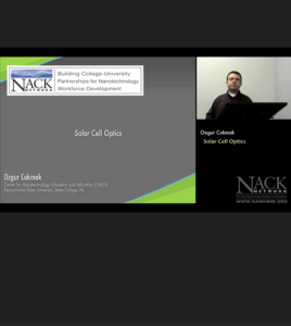 This video, published by the Nanotechnology Applications and Career Knowledge Support (NACK) Center at Pennsylvania State University, provides an overview of optics in solar cells for further discussion of nanotechnology and solar cells. During the video, Ozgur Cakmak from Pennsylvania State University begins by defining and introducing light and related concepts followed by a discussion of light absorption in solar cells. After, Cakmak investigates different scenarios related to the interaction of light and matter, including reflection/refraction, waveguiding, Fabry Perot resonances, diffraction/photonic crystals, plasmonics, and Mie scattering.