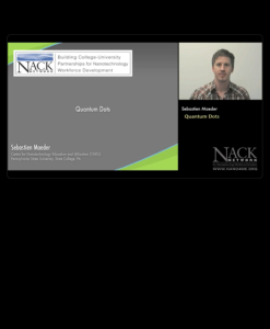 This video, published by the Nanotechnology Applications and Career Knowledge Support (NACK) Center at Pennsylvania State University, provides an overview of quantum dots (QD) in nanotechnology. The video briefly introduces quantum dots as a concept followed by a discussion of quantum confinement and QD synthesis, including colloidal methods and epitaxial growth. Also discussed are are specific applications of QD in biology as light emitters along with other additional QD applications.