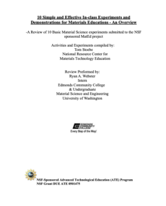 This eleven-page review from Edmonds Community College evaluates ten laboratory activities that demonstrate material science concepts. The activities cover a range of materials, from polymers to metals. Each review summarizes the laboratory activity and evaluates the the effectiveness of the activity in achieving its educational objectives. The laboratory activities reviewed include the following: