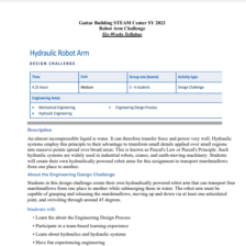 This 7-page resource, published by the American Samoa Technician Education Readiness Pathway Project (ASTERP), is a lesson plan for a 6-week robotic arm building activity. Students "will create their own hydraulically powered robot arms for this assignment to transport marshmallows." The lesson plan includes instructions, a lesson timeline, materials and facilities needed, resources for building the robot arm, and learning objectives/lesson outcomes. Throughout the activity, students will: